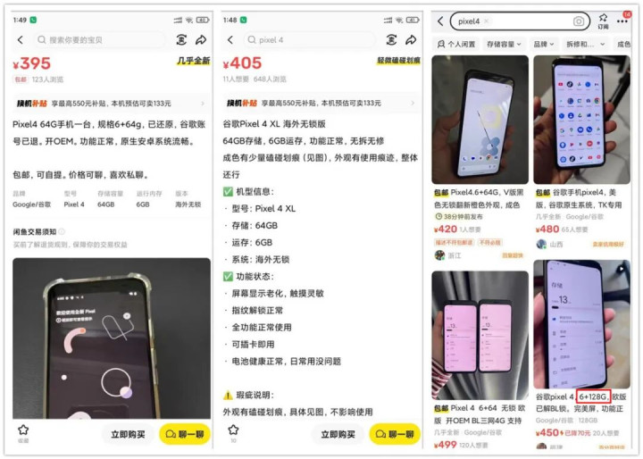 至于二手价格,6G+64G完美屏我找到个人最低价是395元,贩子最低价是405元,6G+128G要贵几十元,我找到是450元。不嫌额头丑的话,买Pixel4当备用机玩玩还行,162克很轻。